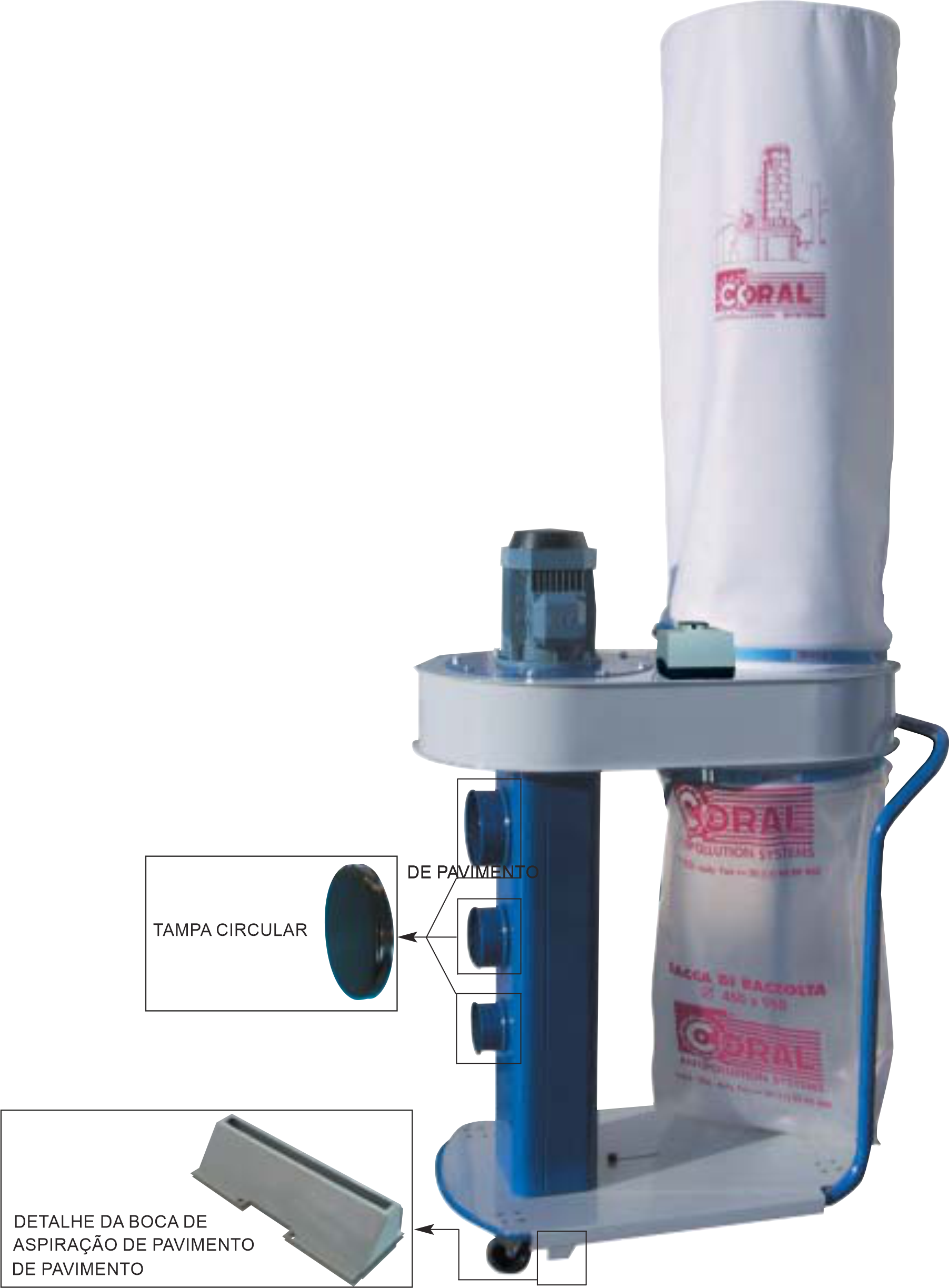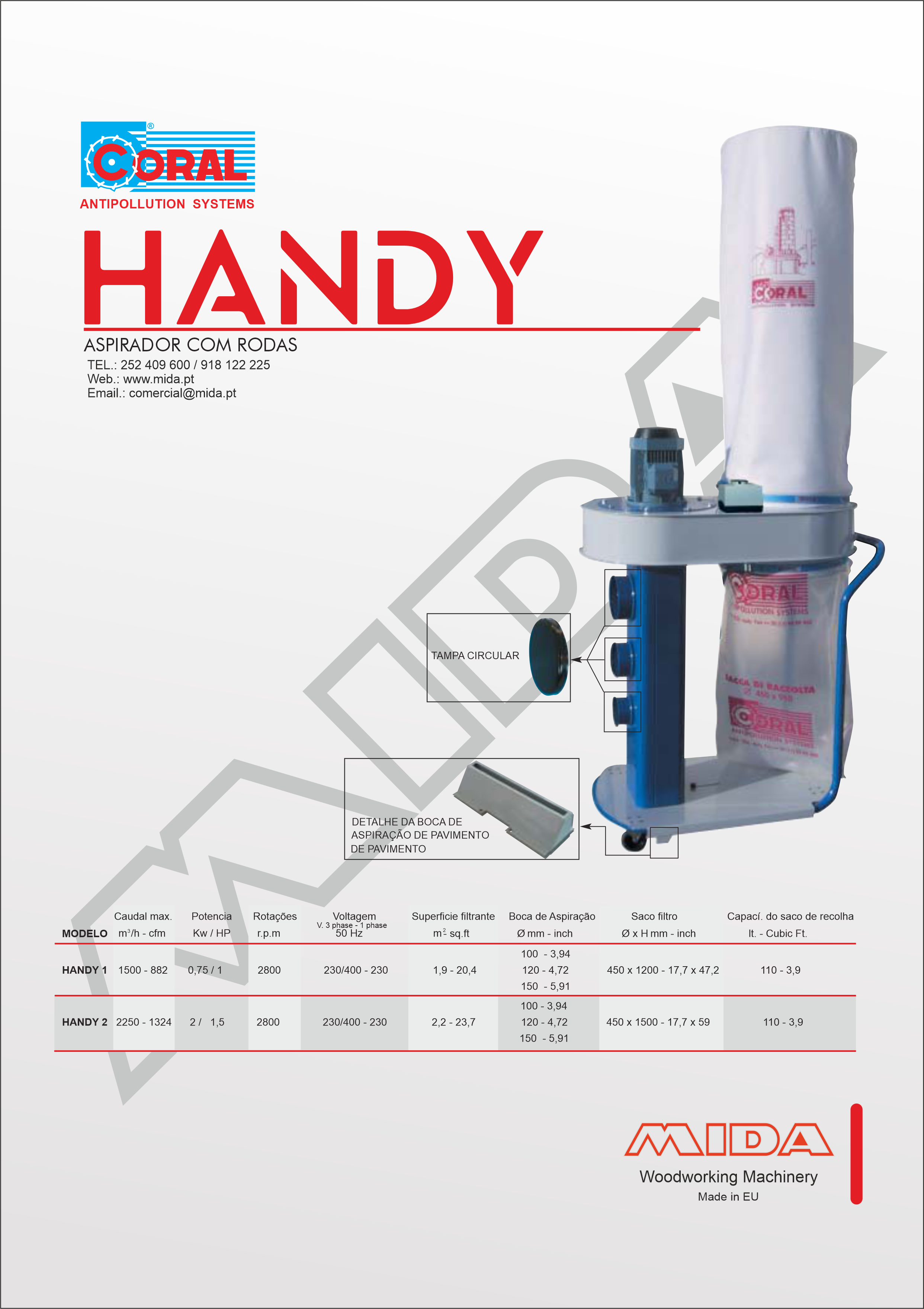 | MODELO | Caudal max. | Potencia | Velocidade | Voltagem | Superficie filtrante | Boca de aspiração | Saco Filtro | Capacidade saco de recolha |