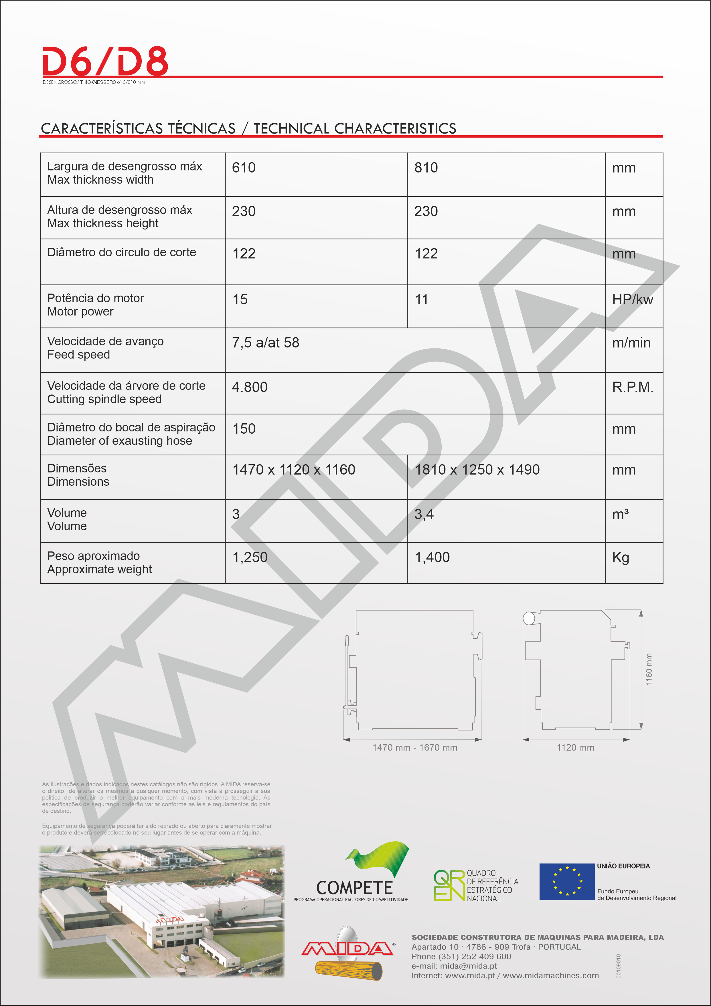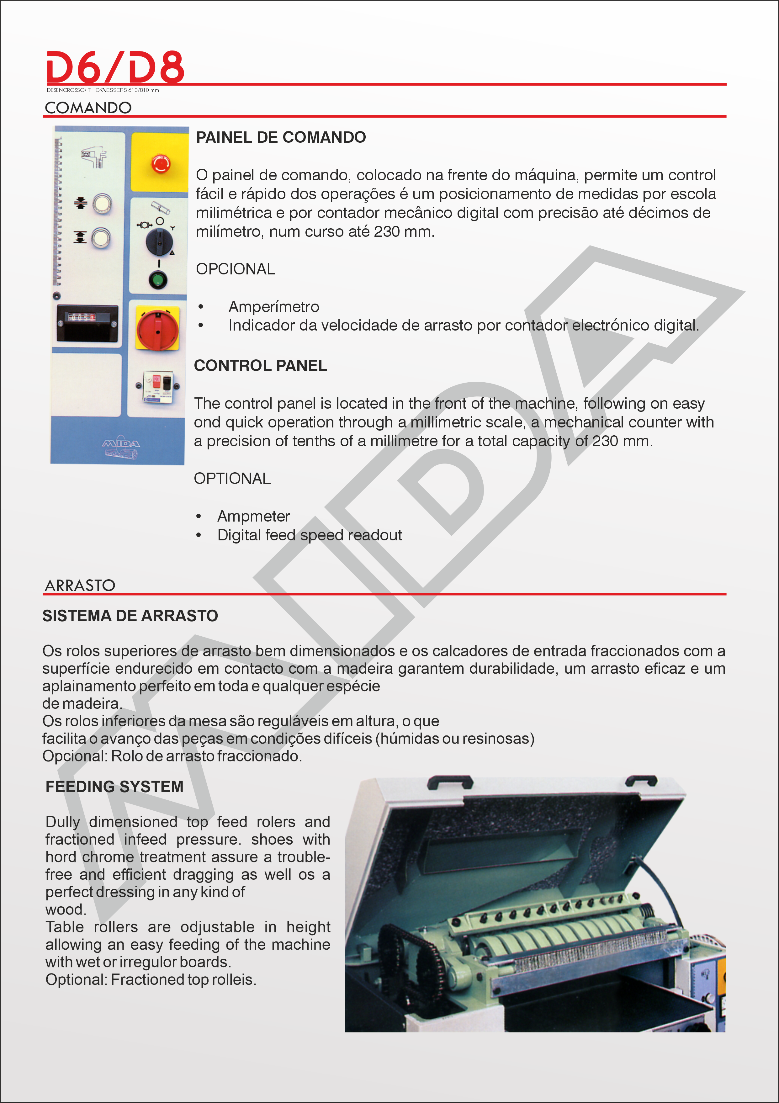 A MIDA D-6 pode trabalhar peças de 610 mm de largura por 230 mm de espessura. A robustez desta máquina está assegurada pelo seu tipo de construção totalmente em ferro fundido. As desengrossadeiras “MIDA” foram desenvolvidas com design moderno e tecnologia em conformidade com os normas Europeias de Segurança CE. O sistema de arrasto, comandado através de uma caixa redutora em banho de óleo, é acionado por um variador de velocidades progressivas com paragem instantânea por embraiagem. Este sistema sincronizado com a árvore de corte permite a regularidade de marcas de corte. A estrutura base e mesa de trabalho em ferro fundido garantem rigidez, segurança e durabilidade. |