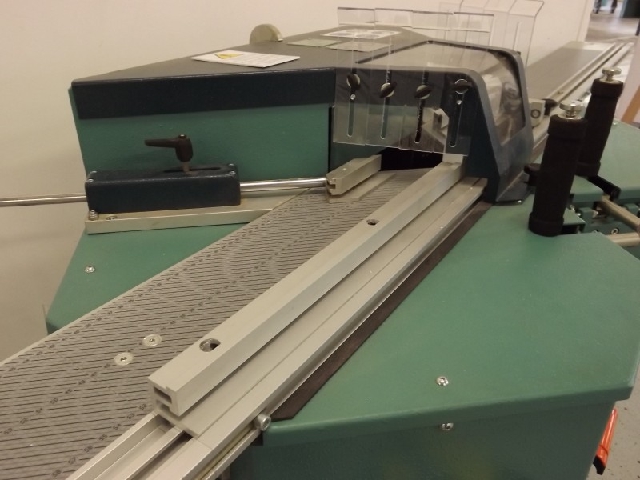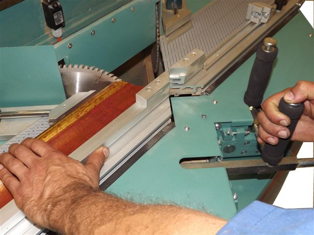 Escala graduada precisa para medir o encaixe das molduras mitralizadas, batente deslizante direito e grampos horizontais mecânicos. com cerca fixa.