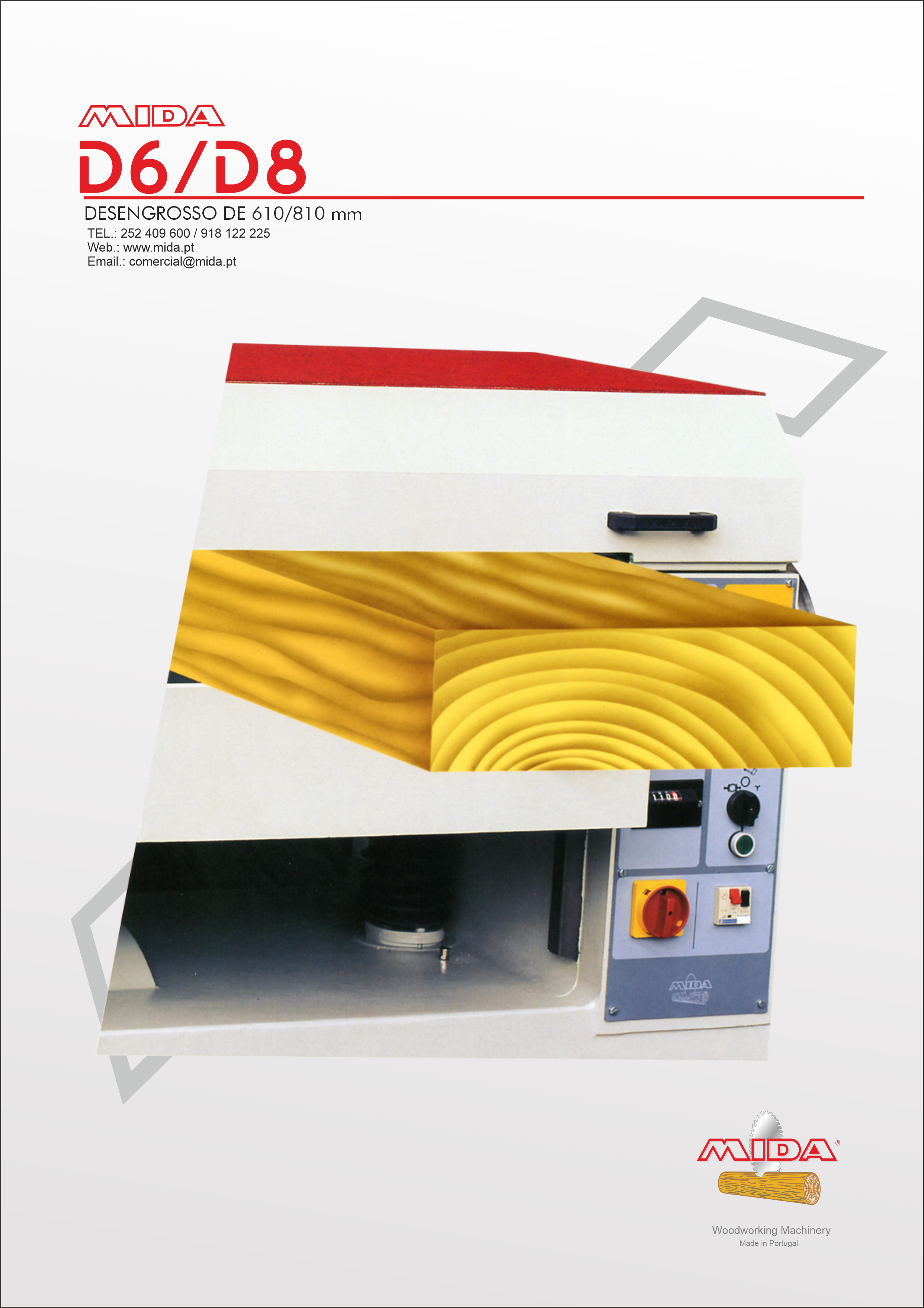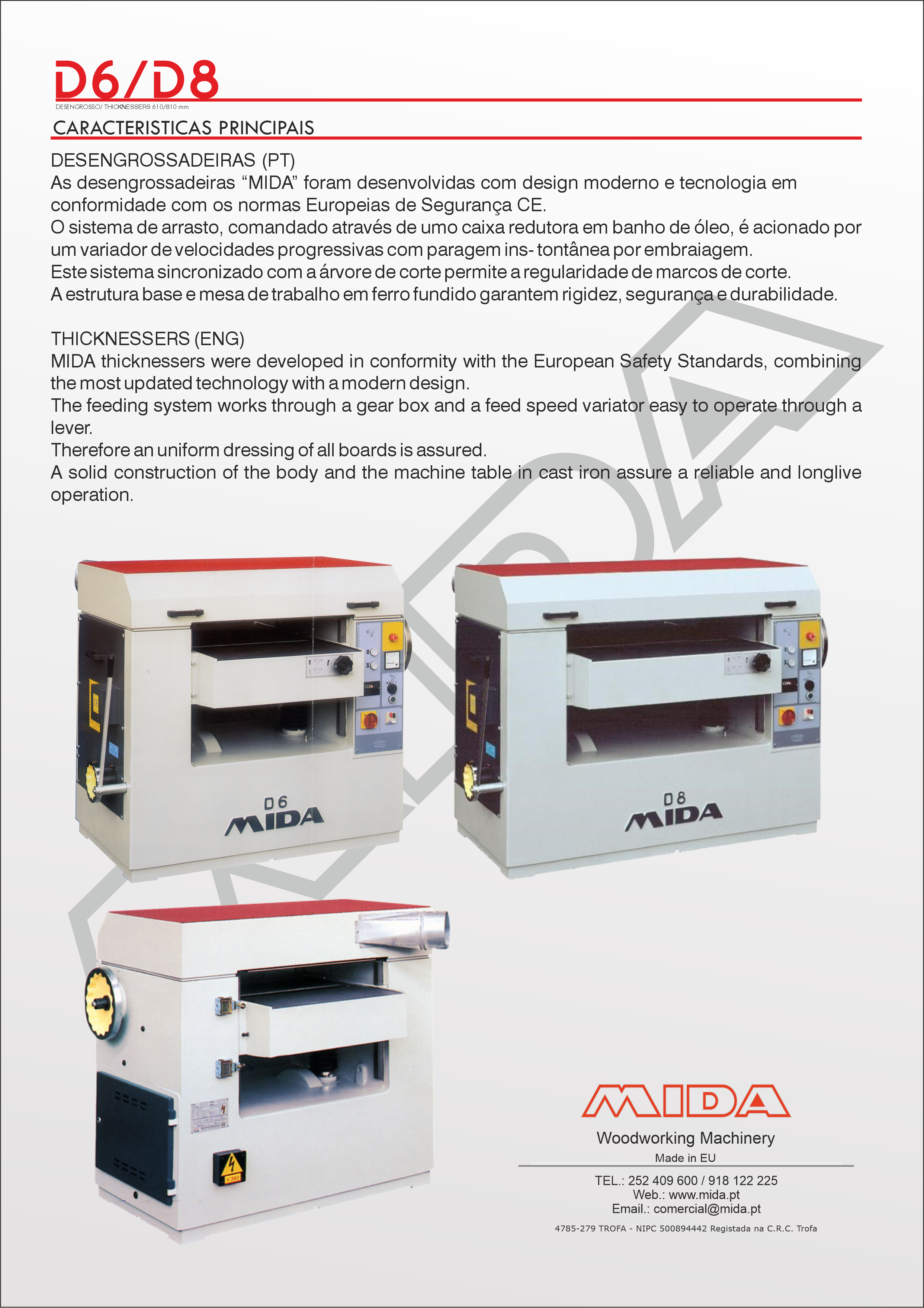 A MIDA D-6 pode trabalhar peças de 610 mm de largura por 230 mm de espessura. A robustez desta máquina está assegurada pelo seu tipo de construção totalmente em ferro fundido. As desengrossadeiras “MIDA” foram desenvolvidas com design moderno e tecnologia em conformidade com os normas Europeias de Segurança CE. O sistema de arrasto, comandado através de uma caixa redutora em banho de óleo, é acionado por um variador de velocidades progressivas com paragem instantânea por embraiagem. Este sistema sincronizado com a árvore de corte permite a regularidade de marcas de corte. A estrutura base e mesa de trabalho em ferro fundido garantem rigidez, segurança e durabilidade. |