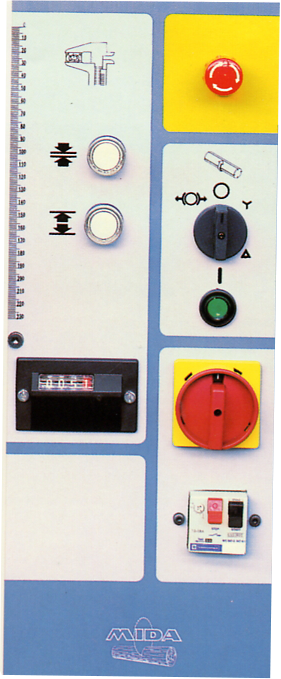 PAINEL DE COMANDO O painel de comando, colocado na frente do máquina, permite um control fácil e rápido dos operações é um posicionamento de medidas por escola milimétrica e por contador mecânico digital com precisão até décimos de milímetro, num curso até 230 mm. OPCIONAL