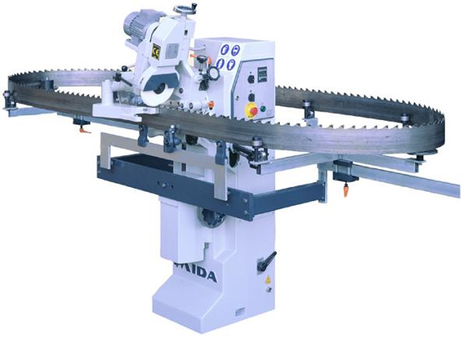 Máquina LHR "MIDA" permite que você execute simultaneamente nitidez automática das bordas da frente, laterais e traseiras dos dentes de serras de fita derrubado com Stellite.