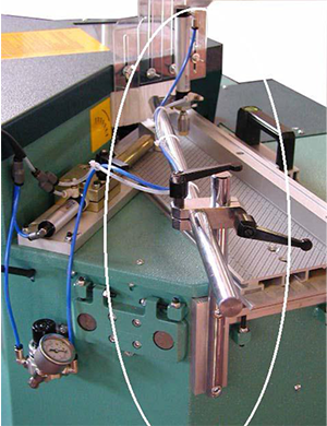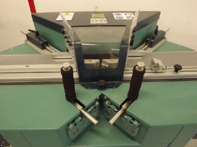 Traçadora de disco de corte manual, com curso horizontal, para "corte em V" a 45º graus, em ambas as extremidades, em molduras de madeira de qualquer formato e tipo (todas as madeiras-alumínio coberto, etc.).