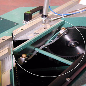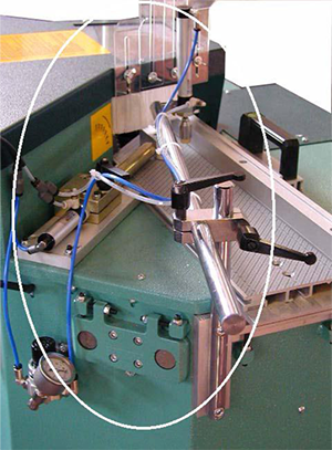 Escala graduada precisa para medir o encaixe das molduras mitralizadas, batente deslizante direito e grampos horizontais mecânicos. com cerca fixa.